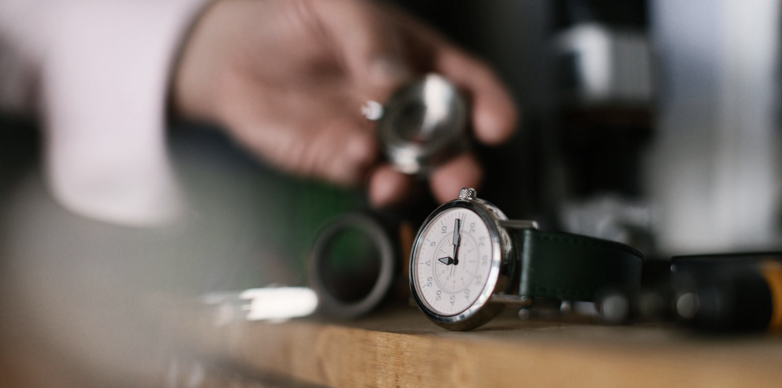 -Stray drew on his industrial design background when creating the watches, a field sharing horology’s focus on sustainability, good design and quality. The design of the classic watch itself makes a clean foil for the patented tech.